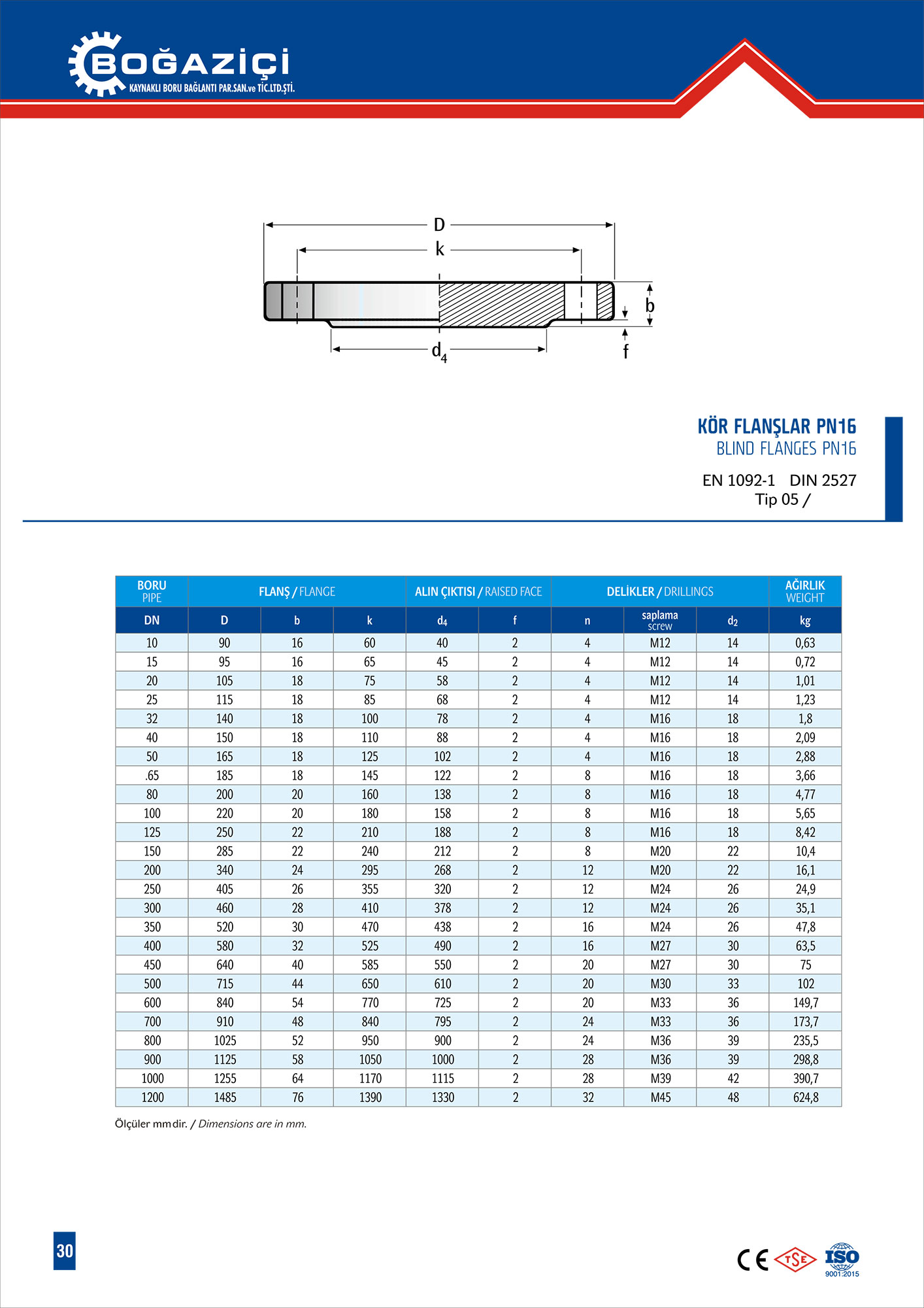 KÖR FLANŞ BASINÇ SINIFI 150 LB